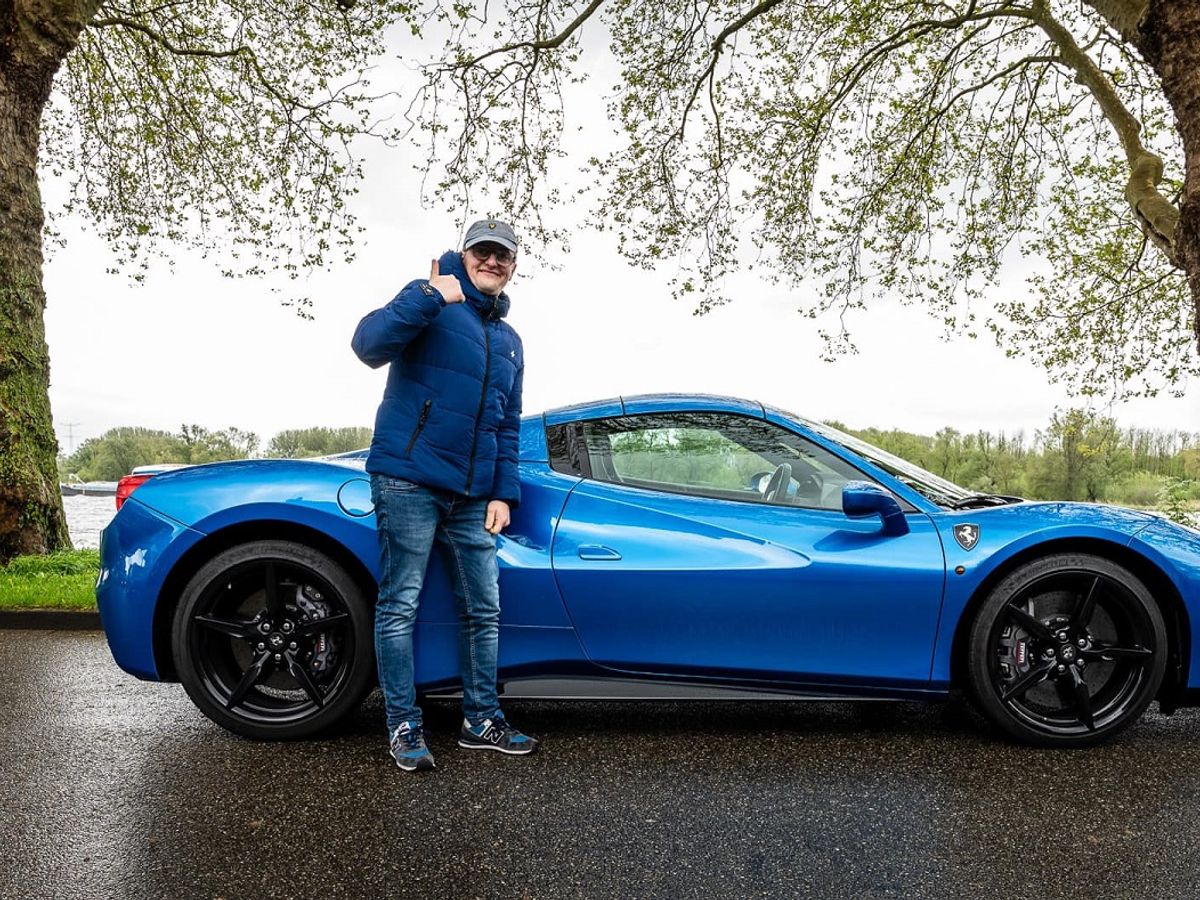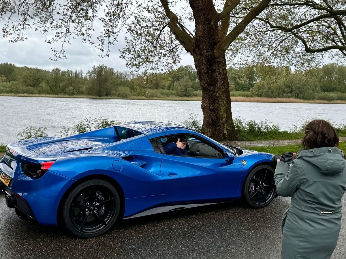 Hoe geweldig tof is het dan om een supercar te regelen in de kleur blauw…kan dat? Ja zeker. De Ferarri mocht weer van “stal” om een ritje te rijden. Sander z’n jas donkerblauw, met een licht blauwe Ferrari…prima combinatie! Sander heeft genoten en geniet nog na van de rit!